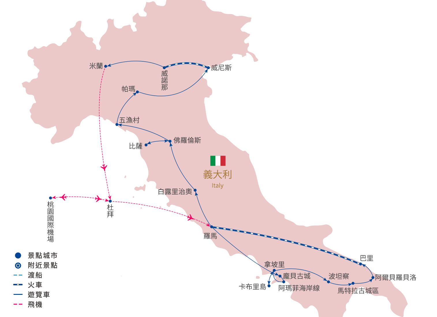 2026/06/08(一) | 桃園國際機場出發 《愛不釋手 義大利全覽14日》雙點進出+雙火車│一晚五星│米其林│五漁村│蘑菇村│馬特拉│入住威尼斯島上機位 22 候補0 已售8 可售13前10名早鳥優惠3000元 |
