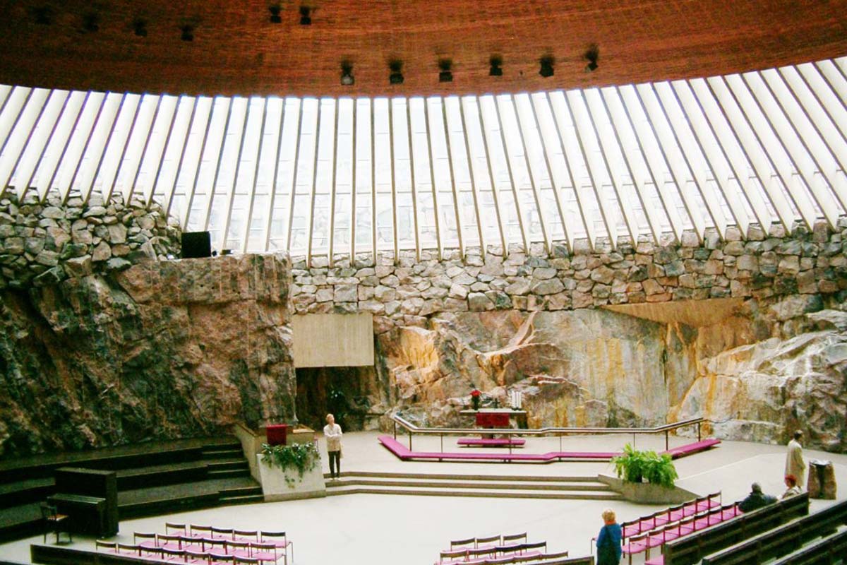 這座開鑿巨大岩盤而成的教堂,猶如一個大飛碟,內部高聳的銅製圓形屋頂,利用許多鋼梁撐起,旁邊開了180個天窗,整體採光十分充足,教堂牆壁保留了原來的岩石材質,讓走入教堂的人身處被自然與陽光環抱的寧靜感受。