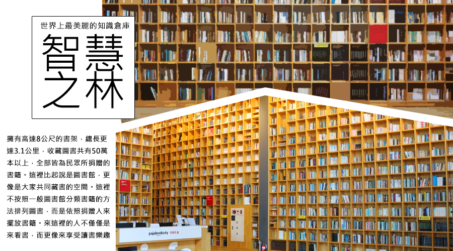是位於首爾近郊京畿道的圖書館,因為藏書量大、滿是一個個整面幾乎頂天的書櫃牆超壯觀。少女時代出道歌曲《閃亮新世界》的MV拍攝地,孝淵的霹靂舞片段即是在這裡的戶外樓梯上拍攝而成。曾獲得建築獎的獨特建築景觀亦吸引了《羅曼史是別冊附錄》、《夫妻的世界》等多部電視劇前來取景拍攝。