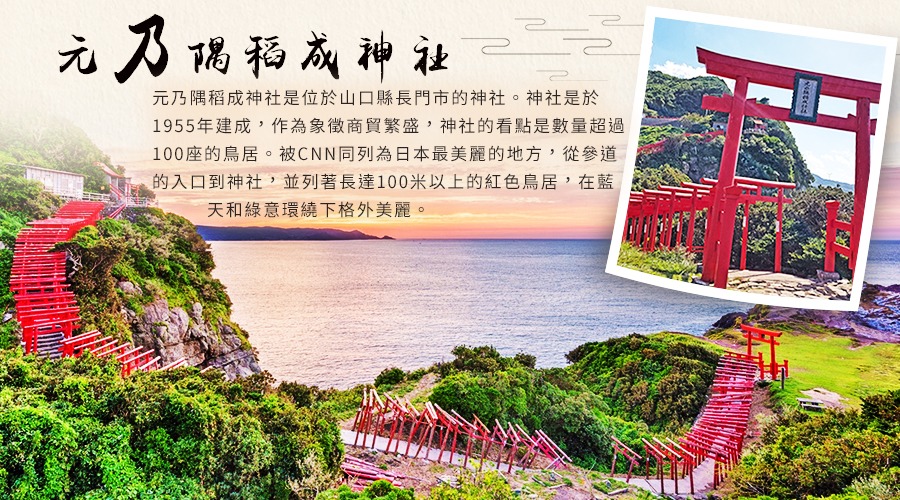 元乃隅稻成神社是位於山口縣長門市的神社。神社是於1955年建成,作為象徵商貿繁盛,神社的看點是數量超過100座的鳥居。被CNN同列為日本最美麗的地方,從參道的入口到神社,並列著長達100米以上的紅色鳥居,在藍天和綠意環繞下格外美麗。