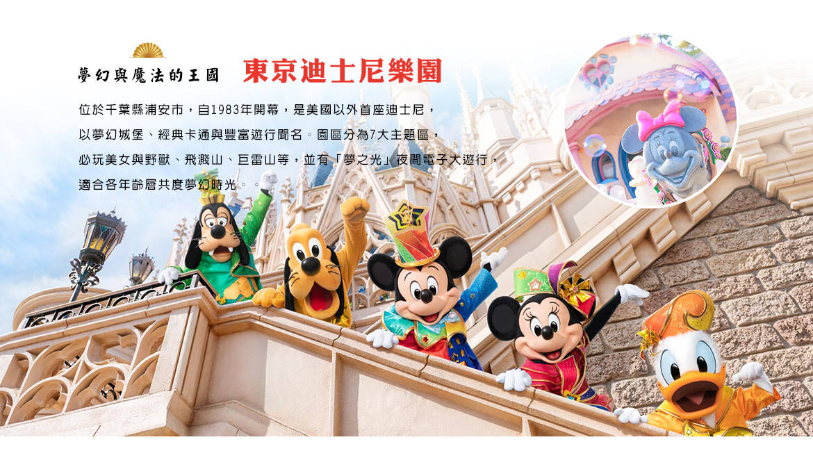 02.東京迪士尼可選擇“樂園”或“海洋”參觀,因團體票券須事前預約,請於出團前7個工作日告知。如臨時更改請自行排隊且自費購買個人票入園。