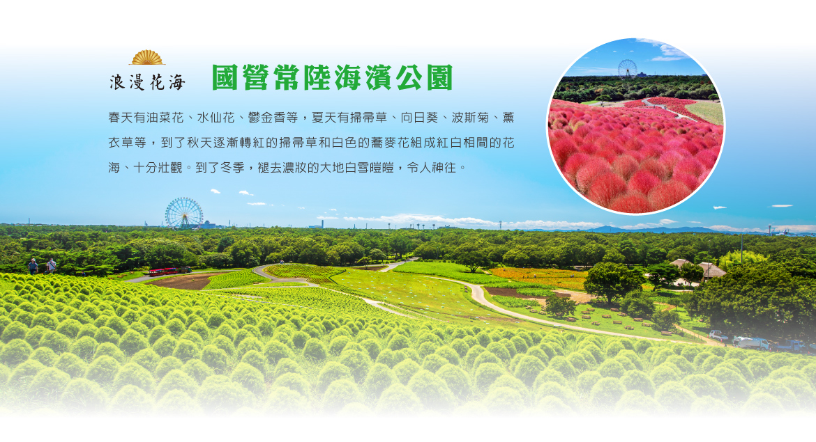 【常陸海濱公園】著名的國營花卉公園,占地約200公頃,以四季分明的花海聞名。最具代表性的是春季450萬朵粉蝶花染藍的「夢幻藍色山丘」與秋季轉紅的「掃帚草」,搭配娛樂園區、單車道,適合全家大小旅遊。