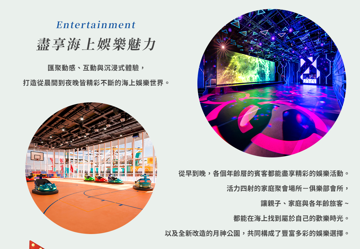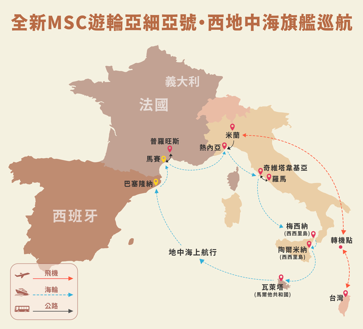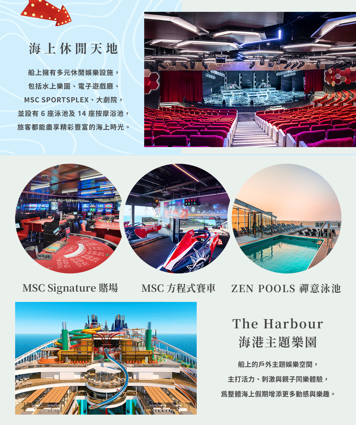 郵輪航行於風光明媚的地中海之中,豪華郵輪上有各式各樣為您精心設計的活動,歡迎貴賓們來加入,今日您可在豪華巨輪上輕鬆愉快的享受現代化的遊樂設施、大劇院、夜總會、歌舞廳、酒吧、游泳池、健身房、賭場、兒童樂園、美容院、圖書館、免稅商店街等。極目藍天大海,品飲美酒香茶,正是此行的享受。郵輪上並為您精心安排精采節目,讓您放鬆身心享受這難忘的地中海郵輪旅程。