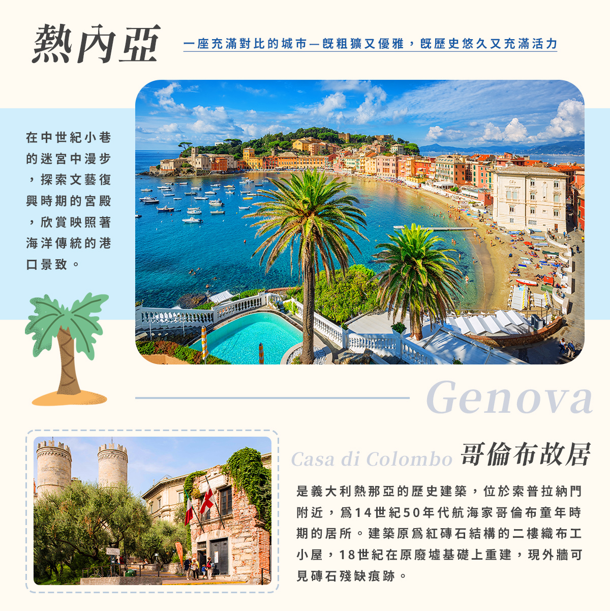 熱內亞是一座充滿對比的城市—既粗獷又優雅,既歷史悠久又充滿活力。在中世紀小巷的迷宮中漫步,探索文藝復興時期的宮殿,欣賞映照著海洋傳統的港口景致。
