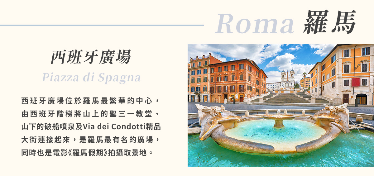 西班牙廣場位於羅馬最繁華的中心,由西班牙階梯將山上的聖三一教堂、山下的破船噴泉及 Via dei Condotti 精品大街連接起來,是羅馬最有名的廣場,同時也是電影《羅馬假期》拍攝取景地。不過要注意的是,2019 年開始羅馬政府規定西班牙階梯前禁止坐下或飲食,否則會被罰款,大家要特別留意喔!