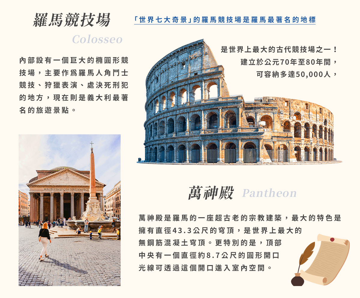 「世界七大奇景」的羅馬競技場是羅馬最著名的地標,也是世界上最大的古代競技場之一!羅馬競技場建立於公元 70 年至 80 年間,有三層樓高,可容納多達 50,000 人,內部設有一個巨大的橢圓形競技場,主要作為羅馬人角鬥士競技、狩獵表演、處決死刑犯的地方,現在則是義大利最著名的旅遊景點。