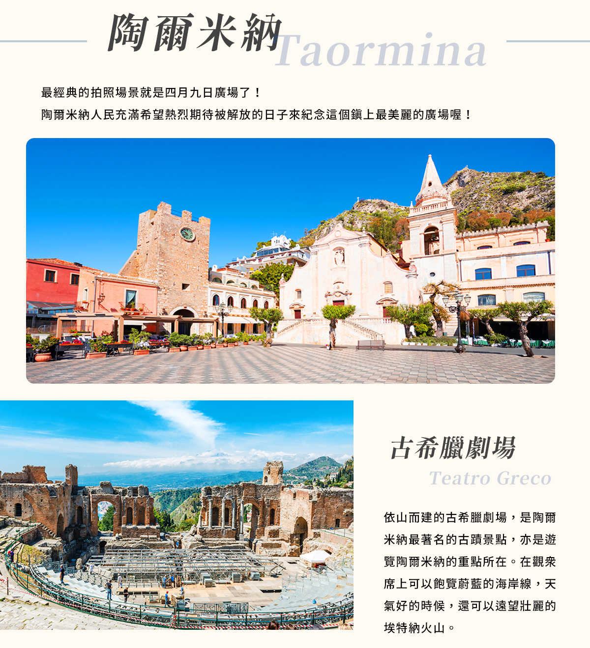 被譽為「愛奧尼亞海珍珠」的陶爾米納,絕對是西西里島上最迷人、最精緻的度假勝地。這座建在懸崖上的古老山城,不僅擁有能眺望埃特納火山 (Mt. Etna) 的壯麗希臘遺跡,還有錯綜複雜的浪漫中世紀巷弄,近期更因為美劇《白蓮花大飯店》而聲名大噪!
