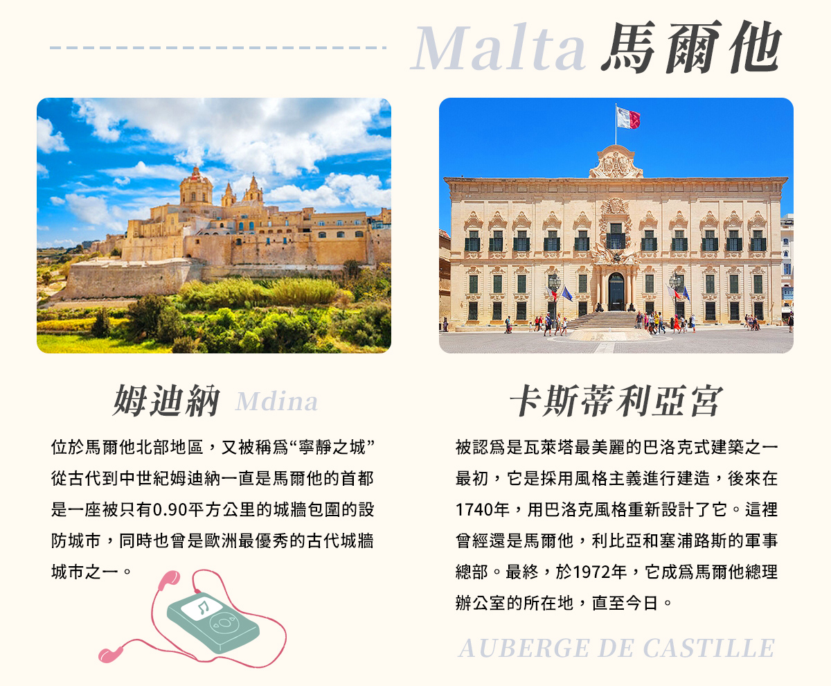 姆迪納位於馬爾他北部地區,又被稱為“寧靜之城”。從古代到中世紀姆迪納一直是馬爾他的首都,是一座被只有0.90平方公里的城牆包圍的設防城市,同時也曾是歐洲最優秀的古代城牆城市之一。