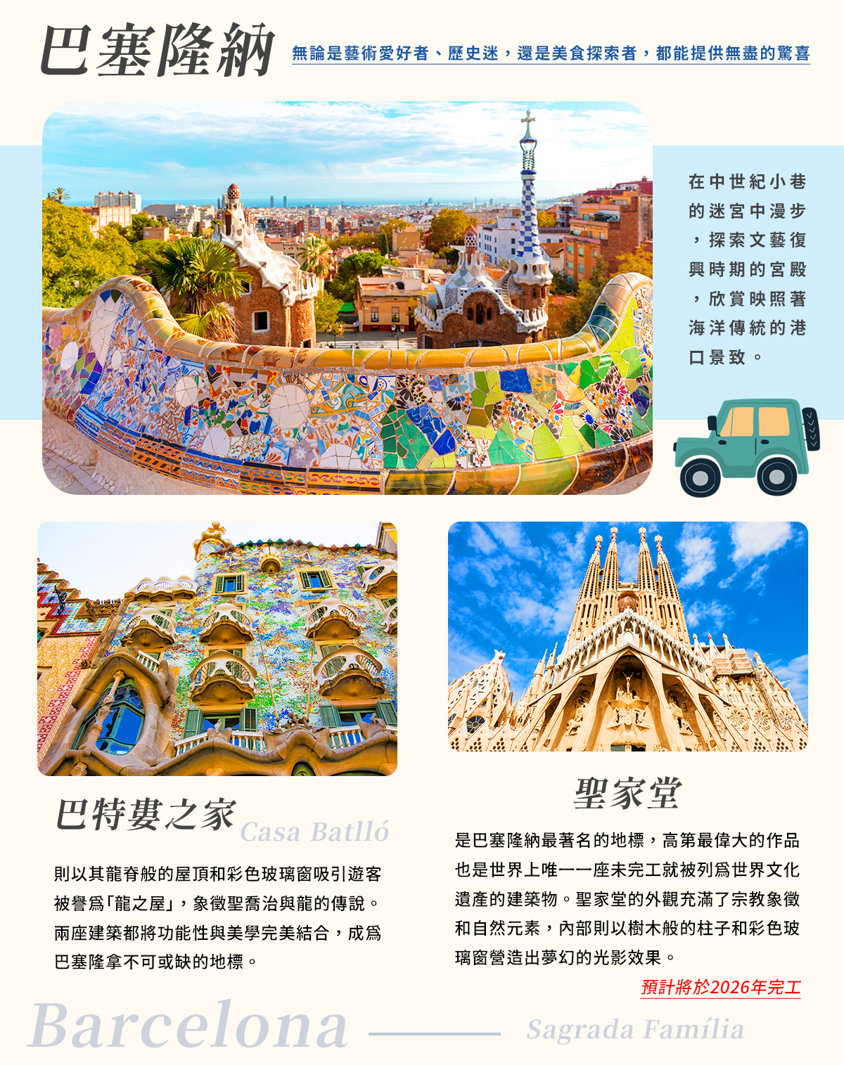 【特別說明】 聖家堂更新團體預訂規則,嚴格把關每日進場人數及開放購票時間。若遇當天預約已滿、無法接受預訂,則改安排參觀【奎爾公園】不便之處懇請貴賓諒解。若您無法接受這樣的替代方案,請勿報名參團,以免影響您的遊興。
