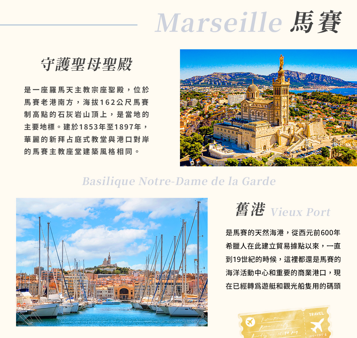 馬賽為法國第二大城市,以人口數計算僅次於首都巴黎;位於法國東南部地中海沿岸,三面環山、一面靠海,馬賽是一座名副其實依山傍海的海港城市,也是法國政府頒發授與“Ville ou pays d’art et d’histoire” 法國藝術與歷史之城標誌的城市之一,更是法國最古老的城市之一。