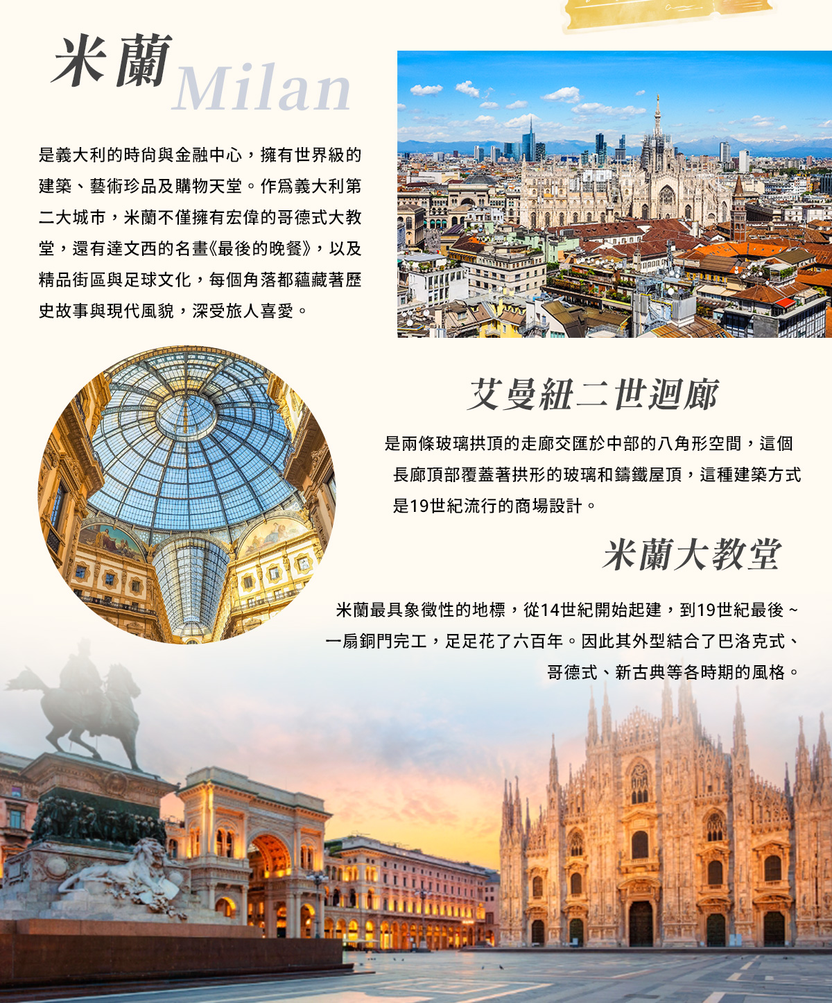 米蘭是義大利的時尚與金融中心,擁有世界級的建築、藝術珍品及購物天堂。作為義大利第二大城市,米蘭不僅擁有宏偉的哥德式大教堂,還有達文西的名畫《最後的晚餐》,以及精品街區與足球文化,每個角落都蘊藏著歷史故事與現代風貌,深受旅人喜愛。