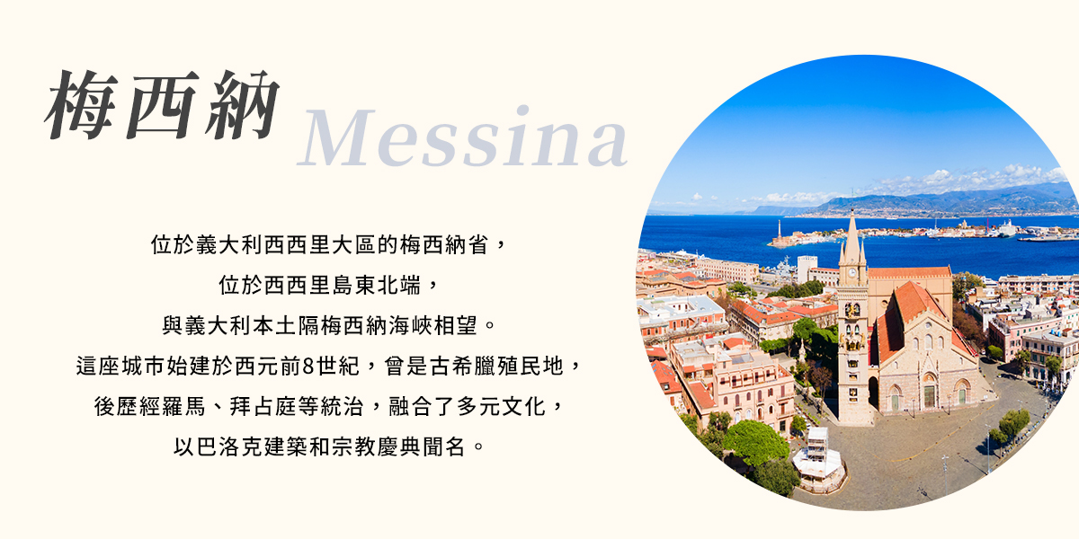 梅西納位於義大利西西里大區的梅西納省,位於西西里島東北端,與義大利本土隔梅西納海峽相望。這座城市始建於西元前8世紀,曾是古希臘殖民地,後歷經羅馬、拜占庭等統治,融合了多元文化,以巴洛克建築和宗教慶典聞名。